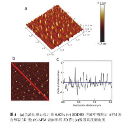圖4(a)親油處理云母片在0.02%(w)SDDBS溶液中吸附后AFM表面形貌3D圖;(b)AFM表面形貌2D圖;(c)吸附高度剖面圖