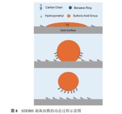 如圖8所示,SDDBS剝離油膜機(jī)理可從以下三個(gè)方面進(jìn)行闡釋?zhuān)紫萐DDBS吸附在油水界面上降低了油水界面張力;其次,SDDBS的二羥基通過(guò)氫鍵作用強(qiáng)化了其與巖石表面吸附,磺酸基團(tuán)富集于巖石表面使得巖石表面由親油轉(zhuǎn)變?yōu)閺?qiáng)親水,極大地增加了油滴在巖石表面接觸角,降低粘附功而使得油膜易于剝離;最后,由于SDDBS在油水界面和巖石表面同時(shí)吸附,增加剝離后油滴與巖石表面間的靜電斥力,使得剝離后油膜不易重新粘附壁面,實(shí)現(xiàn)高效剝離。