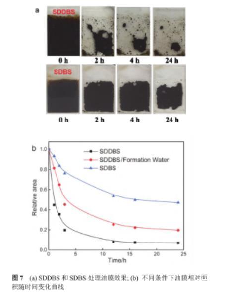 如圖7a所示,經(jīng)SDDBS溶液處理后,油膜面積降低明顯,油膜收縮最終以油珠形式從巖石表面脫離.而經(jīng)SDBS溶液處理后,油膜面積僅有少量減少,24 h后仍有大部分油膜未被有效剝離.油膜相對(duì)面積隨時(shí)間的變化曲線如圖7b所示,SDDBS處理后,24 h內(nèi)油膜面積減小了89%(黑色曲線).而油膜在SDBS中面積僅減小約53%(藍(lán)色曲線),說(shuō)明羥基的引入有效促進(jìn)了油膜剝離.使用模擬地層水(配方見(jiàn)表S2,見(jiàn)支持信息)配置0.02%(w)SDDBS溶液,以相同方法進(jìn)行油膜剝離實(shí)驗(yàn),得到圖7b紅色曲線.由圖可得,地層水條件下SDDBS溶液的油膜剝離效果減弱,24 h內(nèi)油膜面積減小了81%,結(jié)合前述潤(rùn)濕性調(diào)控與界面張力結(jié)果,鹽濃度的增加雖然降低了油水界面張力,但同時(shí)使得處理后表面水下油滴接觸角減小,疏油性減弱,最終導(dǎo)致油膜剝離效果變差,說(shuō)明油固界面潤(rùn)濕性調(diào)控在油膜剝離中起重要作用.較于文獻(xiàn)報(bào)道仍具有優(yōu)越效果,說(shuō)明制備的SDDBS具有良好的油藏環(huán)境適應(yīng)性,實(shí)際應(yīng)用潛力巨大.