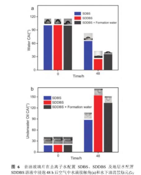 親油處理后玻璃片的空氣中水滴接觸角為100.2°,水下油滴接觸角為19.2°,為疏水親油性質(zhì).將親油玻璃片分別浸泡在0.02%(w)去離子水配置的SDBS、SDDBS溶液和地層水配置的SDDBS溶液中48 h,使用接觸角測(cè)量?jī)x分別測(cè)量不同處理時(shí)間下其水滴接觸角及水下油滴接觸角.結(jié)果如圖6所示.SDDBS潤(rùn)濕性調(diào)控能力較SDBS有較大提升,處理后空氣中水滴接觸角由65.1°降至24.5°,水下油滴接觸角由87.3°升至153.9°.經(jīng)SDDBS處理后的玻璃片呈現(xiàn)親水/水下強(qiáng)疏油性質(zhì).為探究鹽對(duì)界面潤(rùn)濕調(diào)控性能的影響,使用地層水配置的SDDBS溶液處理親油玻璃片,結(jié)果表明處理后空氣中水滴接觸角為35.6°,水下油滴接觸角為133.6°,說(shuō)明地層水的引入降低了SDDBS對(duì)親油表面的親水疏油調(diào)控效果.這是由于地層礦化度條件下,SDDBS分子鏈團(tuán)聚影響界面吸附,導(dǎo)致潤(rùn)濕調(diào)控能力略有下降.