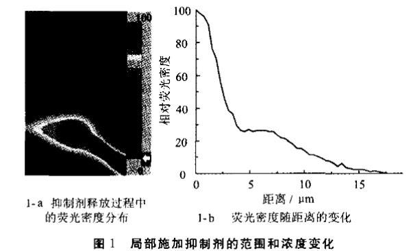 將抑制劑注入加藥微管,加藥微管直徑約3μm,吸藥管直徑約30μm,兩管相距約30μm。通過氣泵調節壓力,控制藥物作用范圍直徑約15μm。加藥管靠近子細胞一端極區,以避免加入的抑制劑流入分裂溝處。加入CD的范圍和濃度變化可以通過羅丹明熒光素顯示,熒光強度的變化代表抑制劑作用濃度梯度,施加的抑制劑在距離中心15μm以外的范圍濃度很低,見圖1。