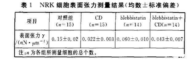 各組細胞的表面張力γ經過OriginPro 8.0統計,結果以均數±標準偏差表示。對處理組與對照組細胞表面張力γ進行t檢驗,經過相關性統計分析,均有顯著性差異(P<0.05)。