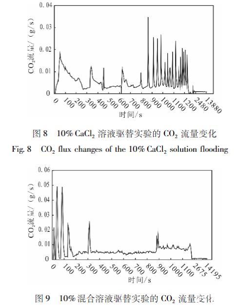 由CO2流量曲線可以發現,以驅替液突破巖心為分界點,也可以將CO2流量隨時間變化劃分為兩個階段:驅替液突破巖心前,CO2流量隨時間都發生較大的波動(活塞式驅替階段);驅替液突破巖心后,CO2氣體流量迅速減少,并且最終趨于一個穩定值,CO2流量曲線幾乎不再波動帶式驅替階段)。因為活塞式驅替階段中驅替出的CO2速率是劇烈變化的,所以CO2流量隨時間發生了較大的波動。這一穩定值的出現,是因為實驗開始一段時間后,巖心中可被驅替的超臨界CO2已被完全驅替,巖心中只剩下被毛細力所束縛的CO2。驅替液流出后,由于溫度和壓力的降低,本來溶解在驅替液中的CO2散逸出來,而驅替液初始溶解的CO2量是一定的,散逸出的CO2也是一定的,所以CO2氣體流量最終趨于穩定。對比圖6一圖9發現,10%NaCl和10%CaCl2溶液驅替實驗的CO2流量曲線隨時間波動最為劇烈,混合溶液次之,波動最小的是蒸餾水驅替實液驗的CO2流量曲線。