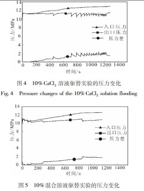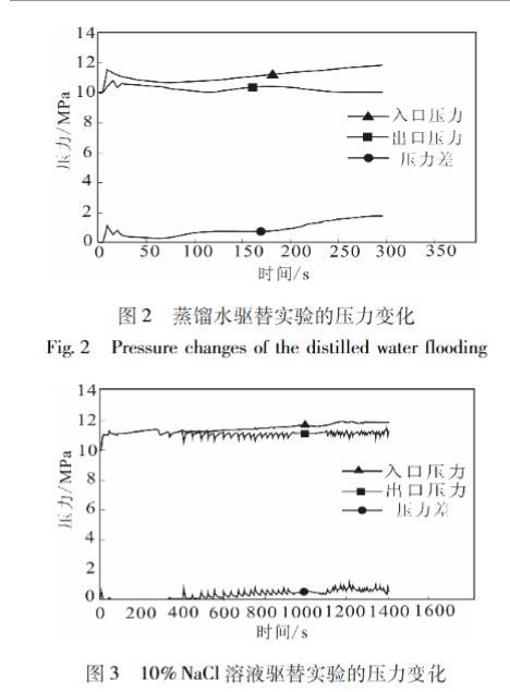 雖然在實驗開始前,會通過回壓控制裝置將壓設置在10 MPa,但是在實驗過程中巖心夾持度的巖心放器的人口、出口壓力會出現波動。通過實驗得到通過回巖心夾持器人口、出口壓力及二者壓力差的變化