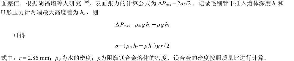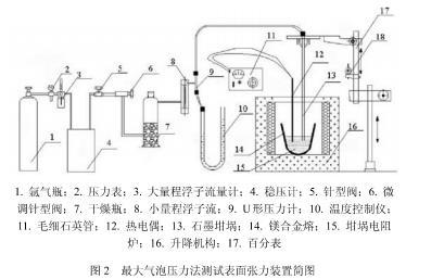 本研究采用“最大氣泡壓力法”測量阻燃鎂合金熔體的表面張力。實驗裝置見圖如圖2所示。采用高純度氬氣作為工作氣體,干燥瓶中裝有CaCl2用于干燥氣體,毛細石英管直徑為2.86mm,端口經過拋光、清洗處理,U形壓力計工作液體為純凈水。
