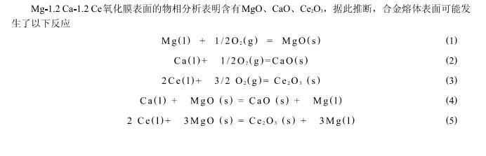 從式(9)、(12)、(15)可知,從熱力學(xué)上講,在氧化開始時(shí)Mg、Ca和Ce 3種元素均有可能發(fā)生氧化;從式(16)、(17)、(18)可以看出,由于活度的影響,式(4)、(5)、(6)所述的置換反應(yīng)在元素分布均勻的情況下不可能發(fā)生;從式(8)、(11)、(14)各氧化物分解壓的計(jì)算,MgO、CaO和Ce_2 O_3分解壓的大小順序?yàn)?PMgO^0>PCaO^0>PCe,O^0.此外,對(duì)氧化膜進(jìn)行X射線衍射結(jié)果表明(圖5),氧化膜中并未出現(xiàn)新的復(fù)雜氧化物,可見MgO、CaO和Ce_2 O_3是互不固溶的.按熱力學(xué)規(guī)律,此時(shí)合金將分層氧化,即氧化膜外層氧壓高生成的氧化物其分解壓也大,氧化膜內(nèi)層氧壓低生成的氧化物其分解壓也小。所以Mg-1.2 Ca-1.2 Ce來說,將按照這樣的順序來氧化:最外層是MgO,其次是CaO,最內(nèi)層是Ce_2 O_3.至此,初始的保護(hù)性氧化膜形成.
