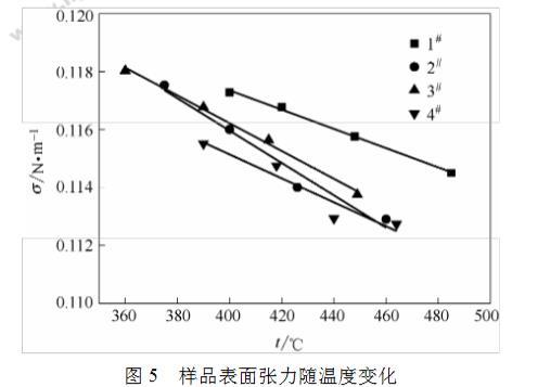 (4)隨著NaBr和KBr質(zhì)量分?jǐn)?shù)的升高和LiBr和CaBr2質(zhì)量分?jǐn)?shù)的降低,混合溴化鹽的表面張力曲線斜率先增大,然后又減小,在4種混合溴化鹽中,相同溫度下1#熔鹽樣品表面張力最大,4#最小。
