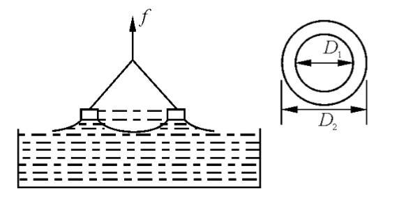 將一內(nèi)、外直徑分別為D1、D2的金屬環(huán)懸掛在定滑輪上。先將它浸入液體中,然后轉(zhuǎn)動(dòng)升降臺(tái),緩慢地將液體下移,此時(shí)金屬環(huán)會(huì)拉起一個(gè)與液體相連的水柱。此水柱的形成是因?yàn)榻饘俚醐h(huán)受到了液體表面張力的作用。由于金屬環(huán)會(huì)受到液體表面向下的拉力,定滑輪給金屬環(huán)向上的拉力逐漸變大,達(dá)到一定值(即為液體表面張力值)時(shí),水柱會(huì)破裂。金屬吊環(huán)受到的表面張力表現(xiàn)為吊環(huán)內(nèi)外圓受到液面以一定的拉力F作用,此拉力方向垂直于線段,大小與吊環(huán)的內(nèi)外直徑呈正比。即