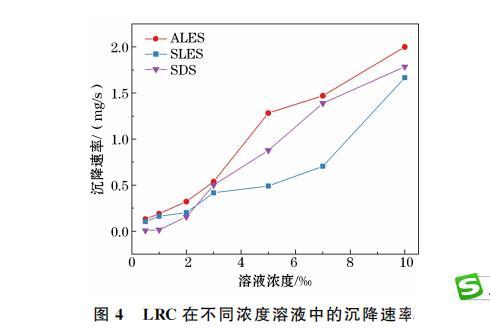 LRC在不同濃度溶液中的沉降時間和沉降速率曲線如圖3和圖4所示。由圖3可知,當溶液濃度處于0.5‰至2‰之間時,煤塵在3種溶液中的沉降時間迅速縮短;當濃度大于2‰時,煤塵沉降時間差異不大。當CSDS≤1‰時,煤塵在SDS溶液中的沉降時間大于1 h,因此,SDS在此濃度范圍內不能快速潤濕LRC。當CALES和CSLES高于0.5‰時,煤塵沉降時間持續緩慢縮短,該濃度范圍內ALES、SLES溶液潤濕煤塵的時間小于500 s。由此可知,低濃度下ALES、SLES溶液比SDS溶液更容易潤濕LRC。由圖4可知,當溶液濃度大于3‰時,煤塵在SDS溶液中的沉降速度大于SLES溶液,拐點處于2‰至3‰之間。因此,當溶液濃度小于拐點濃度時,3種溶液潤濕LRC的能力排序為ALES>SLES>SDS;當溶液濃度大于拐點濃度時,3種溶液潤濕LRC的能力排序為ALES>SDS>SLES。上述分析表明,高、低濃度的ALES溶液對LRC均具有較強的潤濕性。