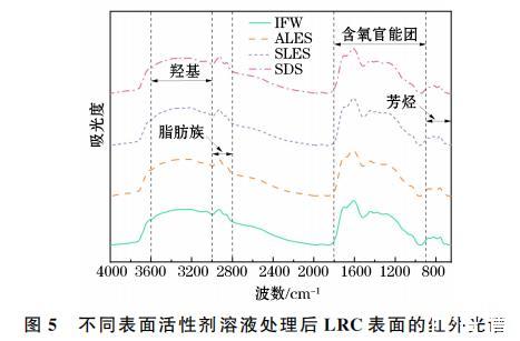 不同溶液處理后煤樣的含氧官能團吸收帶的峰面積和官能團占比見表1。由表1可知,經IFW、ALES、SLES和SDS溶液處理后煤樣的C-O-C的峰面積分別為13.87、14.46、14.73和13.43。表明ALES、SLES在LRC表面均發生了明顯吸附。由于SDS不含烷基醚基團,經SDS溶液處理后煤樣的烷基醚基團所對應的峰面積并沒有明顯增加。由于NH4+(1385~1500 cm-1)的非對稱變角振動與-CH3、-CH2的變形振動重合,因此將-CH3、-CH2的變形振動對應的峰面積進行加和分析。經不同溶液處理后煤樣的NH+的非對稱變角振動的峰面積占比分別由25.6%(IFW)增加至26.7%(ALES)、25.9%(SLES)和26.8%(SDS);-CH3和-CH2所占峰面積分別由69.55(IFW)增至75.38(ALES)、71.76(SLES)和72.02(SDS)。上述分析表明,ALES在LRC表面的吸附量要明顯大于SLES和SDS在LRC表面的吸附量。