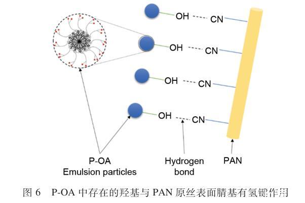 在炭纖維生產(chǎn)過程中油劑是減少表面缺陷的有效措施。本文設(shè)計合成的HA-PDMS,分子兩端有3個羥基,容易與PAN原絲表面腈基(-CN)形成氫鍵(圖6),有利于增加PAN原絲集束性。對P-PAN和J-PAN的性能進(jìn)行了測試,由表2可知,P-PAN強(qiáng)度較J-PAN提高4.6%,斷裂伸長率、纖度、模量、抗摩擦系數(shù)以及變異系數(shù)與J-PAN相當(dāng)。
