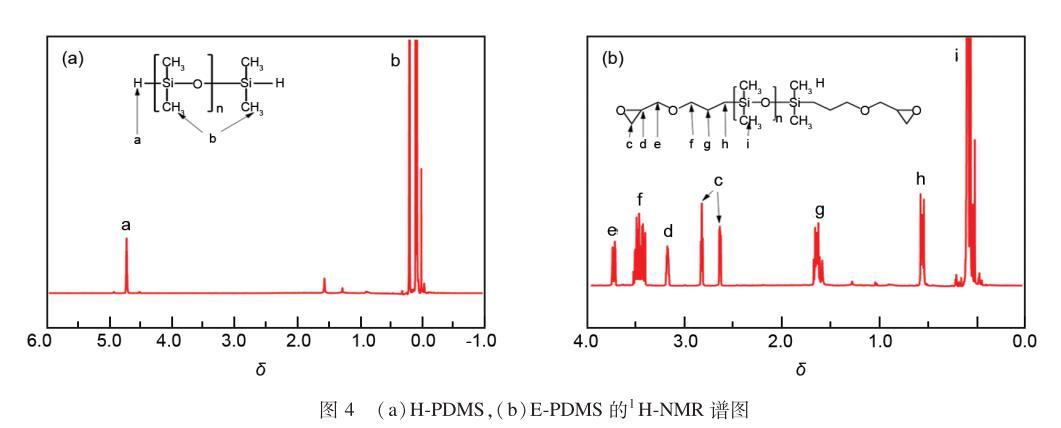 利用1H-NMR對H-PDMS和E-PDMS的形成進(jìn)行結(jié)構(gòu)表征,如圖4(a)所示,a處的位移(4.57)歸屬為Si-H上的氫,b處的位移(0.08)歸屬為Si-CH3上的氫,證明了H-PDMS已經(jīng)合成。如圖4(b)所示,c、d處的位移(2.61~2.80、3.15)分別歸屬為環(huán)氧基團(tuán)上的氫,e、f處的位移(3.70、3.36)分別歸屬為醚鍵兩端的氫,g、h處的位移(1.62、0.57)歸屬為—CH2—上的氫,i處的位移(0.08)歸屬于Si-CH3上的氫,證明了E-PDMS已經(jīng)合成。