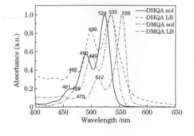 C16DMQA的LB膜吸收峰較C6DHQA進一步紅移約15 nm,且吸收帶明顯寬化。這表明在C16DMQA的LB膜中,J-聚集體的形成更為充分,分子間的激子耦合作用更強。長烷基鏈不僅增強了分子的疏水性,提高了在氣-液界面的穩(wěn)定性,更重要的是,它通過調(diào)節(jié)分子的空間位阻和堆積方式,促進了分子間π-π相互作用的有效重疊,從而形成了更大尺寸或更有序的聚集體結(jié)構(gòu)。