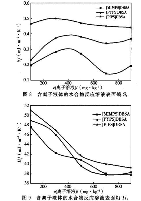 表1是不同濃度的離子液體表面熵S_i、表面焓H_r的值。