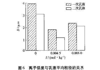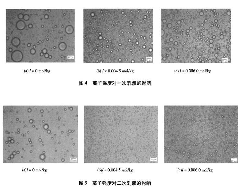 用電子顯微鏡觀察不同離子強度下的乳液情況。圖4為離子強度對一次乳液的影響,圖5為離子強度對二次乳液的影響。由圖4、圖5可知,在離子強度為0的條件下界面張力大,所以制得的乳液粒徑也較大且大小不均一。離子強度為0.0045 mol/kg時,界面張力最小,所以乳化效果較好,制得的乳液液滴粒徑最小,大小也比較均一。離子強度為0.0060 mol/kg時,隨離子強度的增大,界面張力先降低后又回升,所以乳液液滴也增大,而且大小沒有離子強度為0.0045 mol/kg時制備的乳液均一。隨離子濃度的變化,一次乳液和二次乳液粒徑的變化是相同的,如圖6所示。