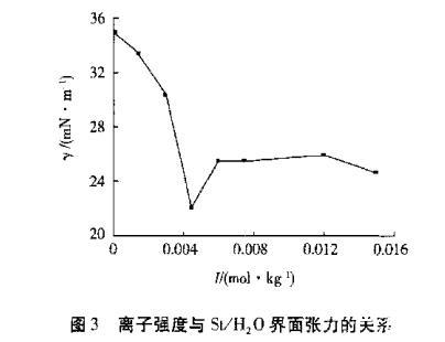 界面張力取決于界面的性質,凡能影響物質性質的因素,對界面張力均有影響。本實驗在水中添加了Na2SO4,改變其離子強度,電荷在St/H2O界面層相互作用對界面張力產生影響。根據下式計算本實驗體系的離子強度(I)。