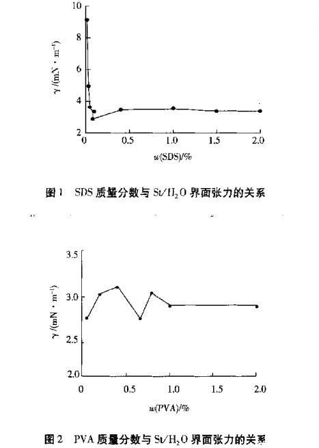 由圖1可以看出,隨著SDS濃度的增加,苯乙烯與SDS水溶液的界面張力先迅速下降,再略有上升,后基本保持平衡。當活性劑在溶液中的濃度達到一定值以后,如果其濃度進一步增加,整個體系的能量達到最低,此時活性劑分子中的長鏈親油基締合在一起,形成膠束,而膠束的存在破壞了油水界面的混合界面膜,因此溶液界面張力又略有回升。SDS的臨界膠束質量分數為0.086%。由圖1也可以得知,對于本實驗體系SDS的最佳質量分數為0.065%。由圖2可以看出,PVA濃度對界面張力的影響不大,作為穩定劑,起到一定助乳化劑的功能。