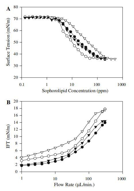 圖4槐脂濃度和流速對(duì)水溶液中的表面張力(a)和界面張力(b)的影響,包括來(lái)自葡萄糖和棕櫚酸(SL-p;d)、硬脂酸(SL-s;s)、油酸(SL-o;)和亞油酸(SL-l;r)的槐脂。