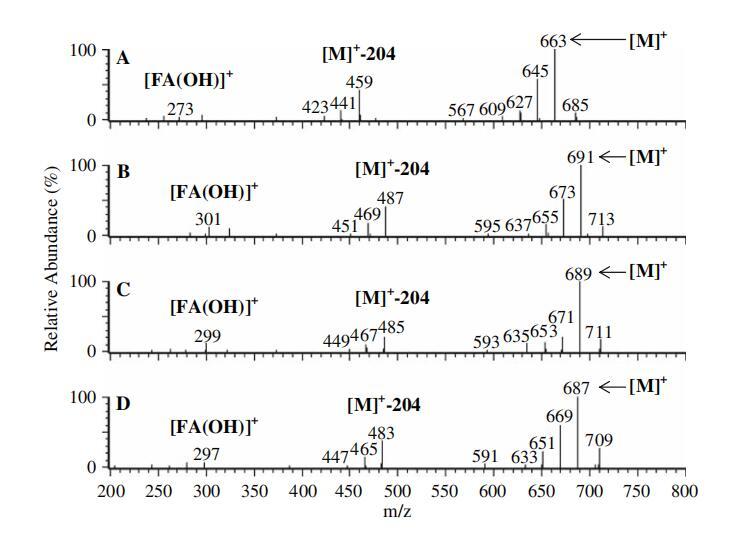 圖3正大氣壓化學(xué)電離(APCI)-來(lái)自圖2中每個(gè)TIC色譜圖基峰的質(zhì)譜圖。 圖2的TIC中的C16:0二乙酰化槐脂內(nèi)酯(RT=16.7分鐘)、圖2的TIC中的C18:0二乙酰化槐脂內(nèi)酯(RT=25.2分鐘)、圖2c的TIC中的C18:1二乙酰化槐脂內(nèi)酯(RT=20.7分鐘)和圖2d的TIC中的C18:2二乙酰化槐脂內(nèi)酯(RT=15.8)。 ([M]+=質(zhì)子化分子離子;[M]+-204=質(zhì)子化分子離子-減去乙酰化己糖(質(zhì)量204);[FA(OH)]+=質(zhì)子化羥基脂肪酸)
