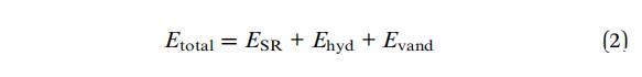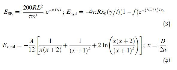 兩種平衡力在組裝的形成中起著重要作用:由兩種粒子之間的界面力控制的疏水相互作用,以及納米粘土團(tuán)簇和系統(tǒng)疏水環(huán)境之間的空間斥力。因此,復(fù)雜核-殼(粘土小體)組裝的總能量由以下三個貢獻(xiàn)的總和給出:相鄰納米粘土團(tuán)簇之間的空間斥力(ESR)、9疏水力(Ehyd)、9和范德華力(Evand):34