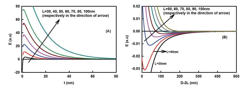 圖5納米粘土簇的長度對粘土小體組裝的影響。(A) 作為界面區(qū)域厚度函數(shù)的能量變化(s?60 nm;T?298 K,f?0.5;姜黃素納米顆粒半徑R?50 nm,疏水衰減長度x0?1 nm,界面張力?40 mN m-1)。(B) 粘粒–粘粒相互作用作為粒間分離D的函數(shù),使用方程(5)計算。當(dāng)存在大的納米粘土團(tuán)簇時,能量最小值的深度減小,當(dāng)L>80nm時,能量變得完全排斥。