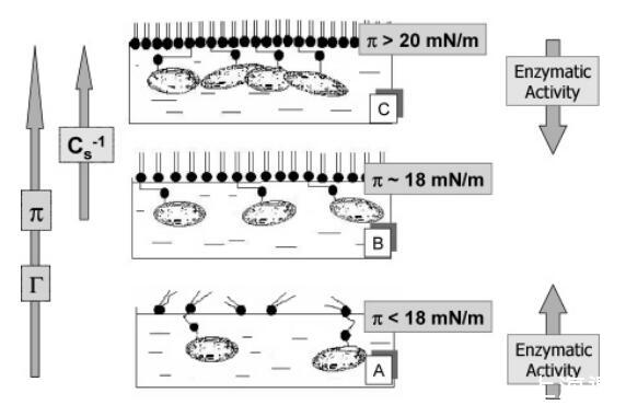 圖5. 在(A)以下、(C)以上和(B)值的表面壓力下,酶/磷脂混合單層的DSAP取向示意圖模型,觀察到單層表面壓縮模量的突然增加。 橫向箭頭表示表面壓力(π)、估計的酶表面密度(Γ)和壓縮模量(Cs-1)的增加方向。