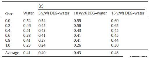 表4純CET、[C10min][Cl]和CET+[C10min][Cl]混合物的表面過剩(Γmax)、每分子最小面積(Amin)、吸附效率(pC20)和吸附自由能(ΔGad 0),作為純水中CET摩爾分數α的函數,并且在T=298.15K時存在不同體積百分比的二元DEG-水混合物。
