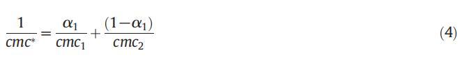 應用偽相模型,我們可以計算二元混合物的理想cmc,該模型基于這樣的假設,即膠束被視為宏觀相,與溶液中相應的單體處于平衡狀態。理想cmc值與單個cmc相關,可使用Clint公式(4)計算: