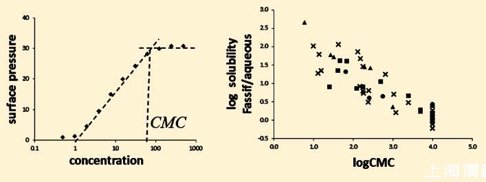 表面張力由一種成熟的體外測定法測定,該測定法通過測量化合物的臨界膠束濃度和兩親性來評估化合物的表面活性劑性質(zhì)。 兩親性是用于量化化合物與生物膜親和力的一個關(guān)鍵屬性,在制藥工業(yè)中廣泛用于預(yù)測藥物誘導(dǎo)的磷脂病,11,12 ? 腦屏障滲透,13和藥物淋巴吸收。 14在這項工作中,我們同樣評估了化合物對生物相關(guān)介質(zhì)中所含膠束的親和力是否可以用化合物固有的表面活性劑性質(zhì)來解釋。 因此,我們對不同化合物的表面活性劑性質(zhì)進行了表征,以將此類表面活性性質(zhì)與FaSSIF中觀察到的與水介質(zhì)溶解度相比的溶解度增強程度相關(guān)聯(lián)。 共分析了51個分子,包括上市藥物和羅氏專利化合物,具有廣泛的溶解性、親脂性和電離狀態(tài)。