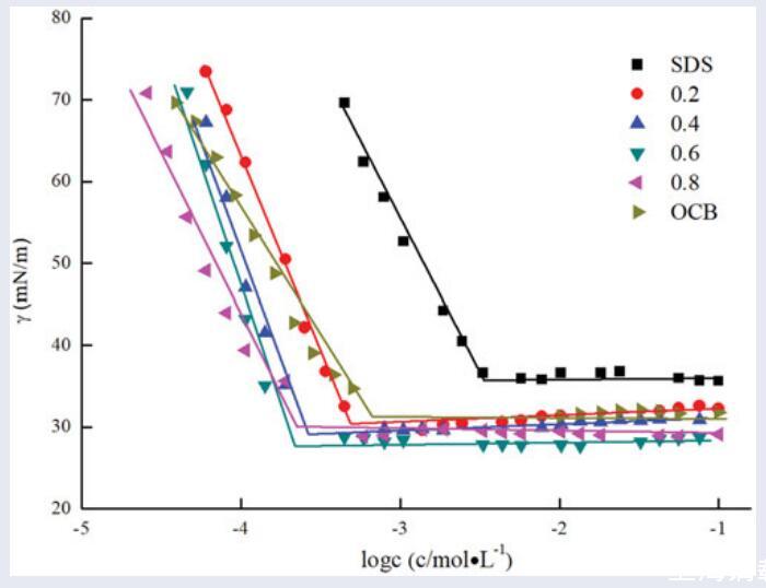 用表面張力法研究了橄欖油兩性表面活性劑(羧基甜菜堿OCB和磺基甜菜堿OSB)與陰離子表面活性劑十二烷基苯磺酸鈉(SDBS)在不同摩爾分數下的表面性質。研究了無機鹽(NaCl、MgCl2)的加入對OCB/SDBS和OSB/SDBS體系表面活性的影響。結果表明,這兩種混合體系在所研究的所有摩爾分數上都比它們各自的組分具有更低的CMC值和更高的表面活性。同時,根據正規溶液理論,通過膠束相互作用參數(βm)確定了OCB/SDBS和OSB/SDBS之間明顯的協同作用。觀察到,αOCB=0.6時的OCB/SDBS混合體系和αOSB=0.6時的OSB/SDBS混合體系表現出最強的協同作用。此外,添加無機鹽后,二元表面活性劑混合物表現出更好的表面活性,并且無機鹽金屬離子的不同價態對混合體系的表面能力影響不同:Mg2+>Na+。