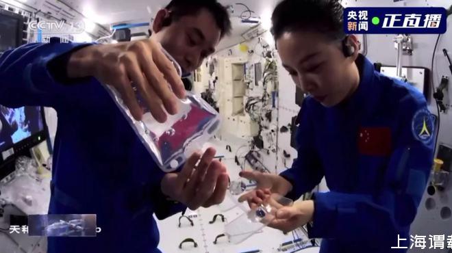 由葉光富將航天員平時所喝的飲用水慢慢傾倒在液橋板上。