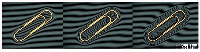 在這個例子中我們成功使密度大于水的回形針漂浮在水面上,水面下面的條狀背景會因為水面的彎曲而變形,從左到右回形針的密度逐漸增大,中間條紋的密度也在逐漸增加。在最右邊的場景中,回形針的密度達到了7.9 g/cm^3(金屬鐵的密度),是水密度的將近8倍,但是依然可以依靠表面張力漂浮起來,得到的條紋分布與真實圖片最為接近。