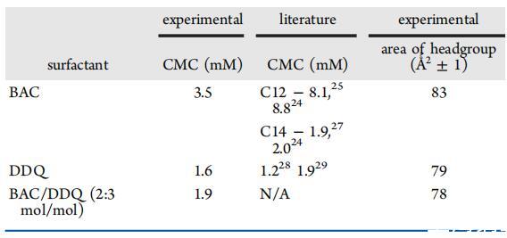 表3:。空氣中BAC、DDQ和BAC/DDQ 2:3 mol/mol的表列CMC和每人頭群表面積值?25°C時(shí)的水界面