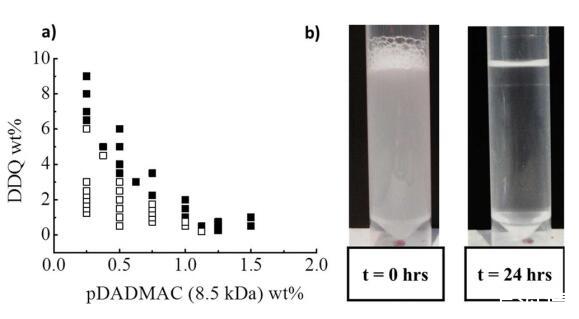 圖2:。(a)25°C下pDADMAC(8.5 kDa)/DDQ/水的相分離邊界:(□)單相和(■)兩個(gè)階段。(b)樣品pDADMAC(3 wt%)/DDQ(3 wt%)/水的相分離圖像(t=自上次攪拌以來的時(shí)間)。