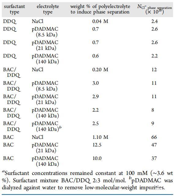 觀察到顯示分離相分離的NaCl/表面活性劑/水混合物,以產(chǎn)生富含表面活性劑的上層相,類似于聚電解質(zhì)/表面活性劑/水混合物中的相分離。這說明,對(duì)于pDADMAC(21 kDa)和NaCl系統(tǒng),可以通過改變BAC/DDQ的比率來控制相界。