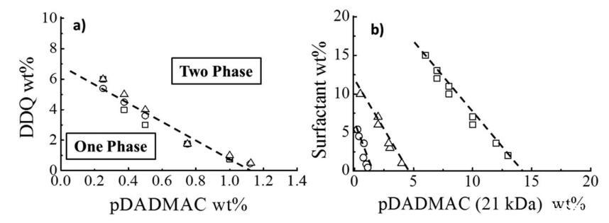 圖4:。(a)pDADMAC/DDQ/水的相分離邊界作為pDADMAC分子量的函數(shù):(□)8.5 kDa(○)21 kDa和(Δ)140 kDa(25°C時(shí))。(b)pDADMAC的相分離邊界(21 kDa)/表面活性劑/水(○)DDQ(□)25°C下的BAC和(Δ)BAC/DDQ(2:3 mol/mol)。虛線表示相界的大致位置。