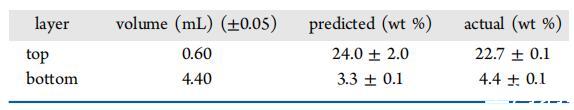 表5:。最后一次攪拌后24小時(shí)pDADMAC 8.5 kDa(3 wt%)/DDQ(3 wt%)/水的頂層和底層重量分析