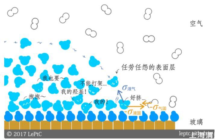 在氣體和液體之外,現(xiàn)在我們?cè)偌尤胄碌慕巧腆w表面。玻璃的表面對(duì)水分子非常有吸引力(雖然玻璃的主要成分是二氧化硅,但它的表面通常會(huì)因?yàn)閮r(jià)態(tài)不飽和而結(jié)合很多羥基)。如果水滴碰到的界面是玻璃,就會(huì)出現(xiàn)跟空氣相反的情況:接觸面的水分子比平衡時(shí)更擠,表面張力是擴(kuò)張的,表面能是負(fù)的,整坨水滴會(huì)希望自己跟玻璃的接觸面積越大越好(同時(shí)跟空氣接觸面積越小越好),形成特定的接觸角θ。這個(gè)角越小,意味著固體表面的親水性越強(qiáng)。