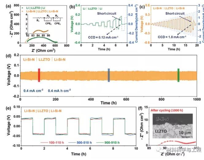 綜上所述,本文首次提出了用微量納米Si3N4(1wt%)調節熔融Li的表面張力來修飾Li|石榴石界面的實驗。從Li-Si-N系相圖出發,結合XRD和XPS分析,發現當加熱1wt%Si3N4和Li金屬的混合物時,Li3N、LiSi2N3和LixSi顆粒的形成是一致的,生成的復合材料稱為Li-Si-N熔體。Li-Si-N熔體通過兩種方式極大地改善了與石榴石的界面接觸: