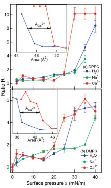 圖6:。作為DPPC(a)和DMPS(b)單分子膜表面壓力的函數,CH3和CH2對稱拉伸振子強度的比值R:純水(藍色)、1 M NaCl溶液(綠色)和1 M CaCl2溶液(紅色)。由于單分子膜的崩塌,在π)40 mN/m時,無法測定Na+-DPPC的比值R。由于壓縮單層膜的νsCH2振幅的不確定性,在較高壓力下,誤差條較大。插圖顯示了作為每種脂質面積函數顯示的比率R。請注意~4?2/脂質置換(解釋為Ca2+足跡),與圖2中的等溫線一致。