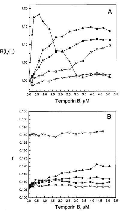圖3:通過芘標記的磷脂PPDPC(X)0.01)的熒光和DPH(X)0.002的穩態發射各向異性r評估顳葉素B對LUV中脂質動力學的影響,顯示為具有XPOPG)0(0)、0.10(9)、0.20(B)和0.40(2)的SOPC脂質體中歸一化準分子與單體比率r(Ie/Im)(圖A)和各向異性r(圖B)的變化,Xchol)0.10(3)。每個數據點代表三次測量的平均值。標準偏差小于0.02(面板A)和0.004(面板B),為清楚起見,未顯示。否則情況如圖2圖例所示。