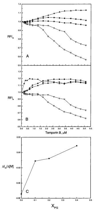 圖2:通過芘標記的磷脂PPDPC(X)0.01的熒光評估顳葉素B對LUV中脂質動力學的影響,分別顯示為芘單體和準分子發射強度Im(圖A),Ie(圖B)的變化,以及在RFIm中達到飽和反應之前Im增加的斜率(圖C)。脂質體由SOPC組成,XPOPG為0(0)、0.10(9)、0.20(b)和0.40(2),Xchol為0.10(3)??傮w積為2 mL的5 mM Hepes,0.1 mM EDTA,pH 7.0,脂質濃度為20μM。使用循環水浴將溫度保持在25°C。每個數據點代表三次測量的平均值。標準偏差小于0.02(面板A和B)和0.004(面板C),為清晰起見,未顯示。