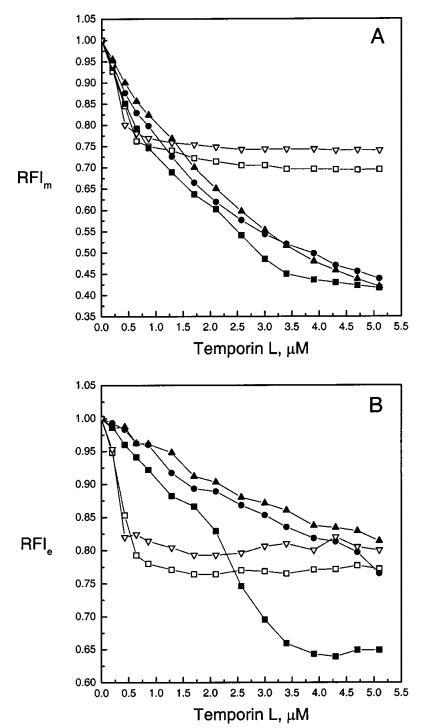 圖4:通過芘標記的磷脂PPDPC(X)0.01的熒光評估顳葉素L對LUV中脂質動力學的影響,分別顯示為芘單體和準分子發射強度Im(圖A)和Ie(圖B)的變化。脂質體由SOPC組成,XPOPG為0(0)、0.10(9)、0.20(b)和0.40(2),Xchol為0.10(3)。每個數據點代表三次測量的平均值。標準偏差小于0.02,為清晰起見,未顯示。否則情況如圖2圖例所示。