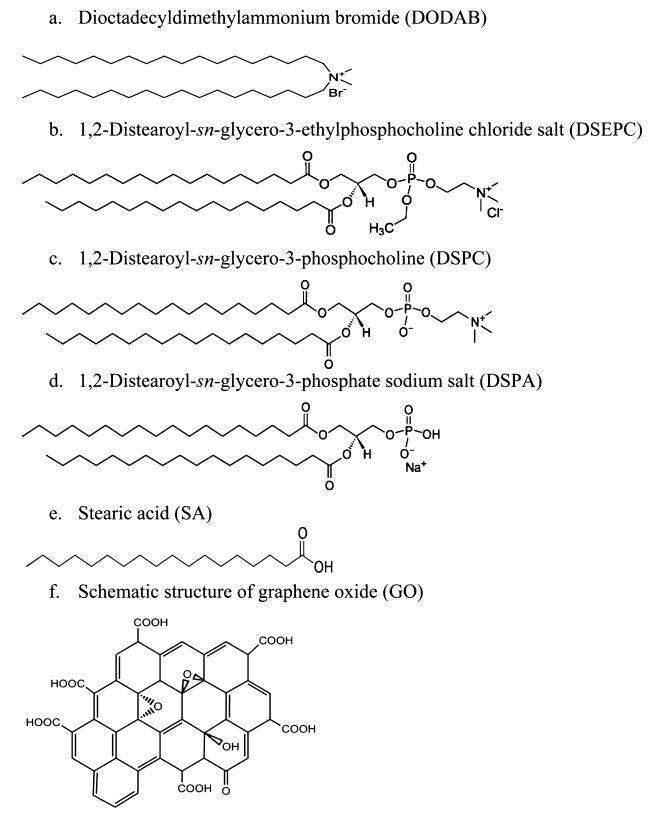 正電荷脂質二十八烷基二甲基溴化銨(DODAB)和1,2-二硬脂酰-sn-甘油-3-乙基磷酸膽堿氯化鹽(DSEPC)、中性電荷兩性脂質1,2-二硬脂酰-sn-甘油-3-磷酸膽堿(DSPC)和負電荷脂質1,2-二硬脂酰-sn-甘油-3-磷酸鈉鹽(DSPA)購自Avanti Polar Lipides(Alabaster,AL)。硬脂酸(SA)購自SigmaAldrich(密蘇里州圣路易斯)。由于頭部基團中存在陰離子磷酸鹽和陽離子季銨中心,DSPC帶中性電荷,如方案1c所示。由于羧基脫質子化,SA被認為是帶負電的分子。所有這些脂質在非極性尾部都有18個碳鏈烷基。光譜級氯仿和甲醇來自MP Biomedicals(Solon,OH)。單層GO購自ACS Material LLC(馬薩諸塞州梅德福德)。所有這些化學品均未經任何進一步凈化。化學結構如圖1所示。實驗中使用的去離子水來自Modulab 2020水凈化系統(德克薩斯州圣安東尼奧)。去離子水的電阻率、表面張力和pH值在20.0±0.5°C時分別為18 MΩ·cm、72.6 mN/M和5.6。所有實驗均在恒溫20.0±0.5°C、濕度50±1%的潔凈室(1000級)中進行。
