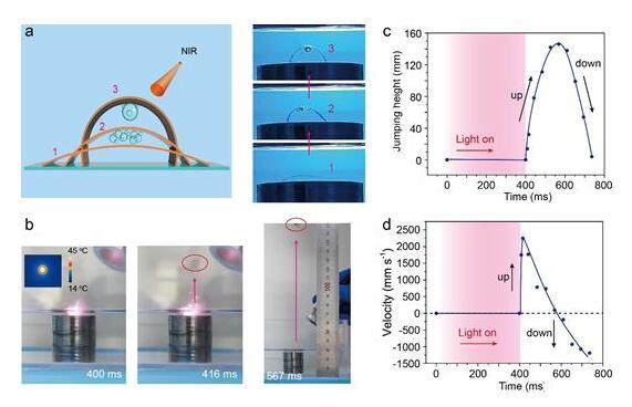 光刺激下驅動器可以在極短的響應時間(400 ms)內從液體介質跳越到空氣中,最高速度為2 m/s,高度可達14.3 cm。