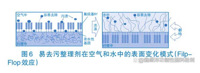 圖5為含氟易去污劑的主要結構含氟易去污整理劑分子中既含有防水防油基團——全氟烷基丙烯酸酯聚合物,又含有親水基團——聚氧乙烯鏈等??椢锝浾砗笕榛湺味ㄏ蚺帕性诶w維表面,排斥水性和油性污物,使其不易沾污。如果織物被污物沾附,在水洗液洗滌時,親水性鏈段定向排列在纖維與液體的界面上,吸引水分子,提高其易去污性能(也叫Filp-Flop,反轉凈洗效應)??椢锼春蠛娓?,親水鏈段脫水,氟烷鏈段重回其主導地位,再度呈現良好的防水防油性能。