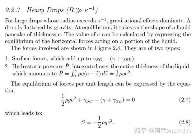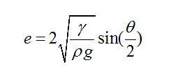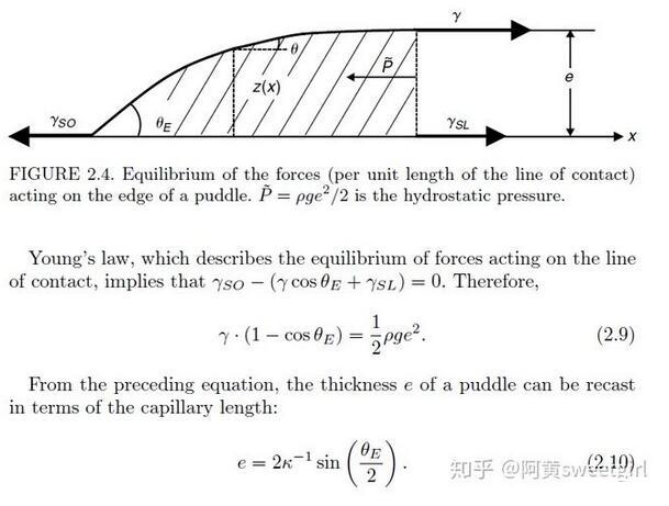 有意思的是,已經(jīng)有前人對這種情形做過詳細(xì)的受力分析。得出只要接觸角一定,此時(shí)無論加多少水,液體的厚度e都不會增加,只會增加鋪展的面積。其厚度e的表達(dá)式為: