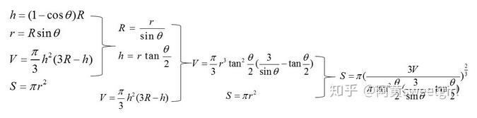 此時(shí)根據(jù)球的體積公式,以及簡單的三角函數(shù)變換,就可以得出S與V和θ的關(guān)系,具體推導(dǎo)過程如圖2所示。