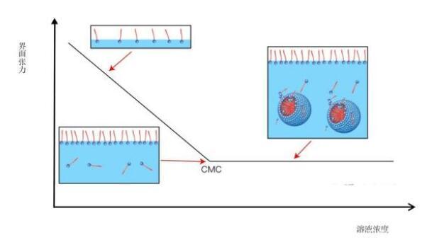 但是當濃度超過一個點時,表面活性劑會開始抱團,形成膠束,界面張力不再下降,這個濃度叫做臨界膠束濃度。