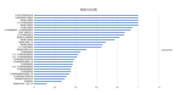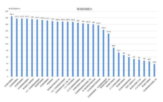 通過對比和排序,我們很快就能篩選出起泡能力好的表活劑,同時也能得到表活劑的起泡規律:(ps:由于相同原料出于不同廠商,其泡沫性能也存在差異,此處用不同大寫字母代表不同的原料廠商)